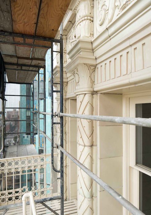 With the exception of work required for restoration and preservation (completed by the historic construction specialists at Spectra), we are leaving intact the Neoclassical-style façade and its elaborate yet refined ornamentation. (An example of the façade's pre-restoration condition is at right; post-restoration is at right and below.) Our scope also included an extensive seismic upgrade, requiring 150 trucks' worth of concrete for the building’s new foundation and sixteen shear walls.
