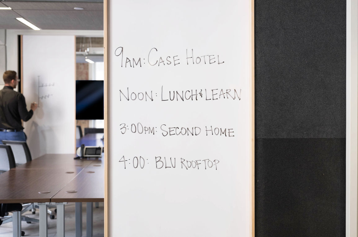 Our scope included meeting and conference rooms following a largely open plan. One large conference room has two acoustic sliding panel systems to provide either three meeting rooms or one large open space for social events. This space is adjacent to a steel-and concrete wet bar housing a beer tap machine. A tectum panel ceiling absorbs sound and conceals mechanical equipment and fire sprinkler heads.