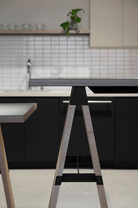 Each speculative suite at ROW DTLA was outfitted with new black and cream kitchens. In place of the traditional boxed-in islands with a jogged counter for accessible seating. We chose a sawhorse leg design allowing the island to look and feel more like a custom furniture piece, creating visual lightness.