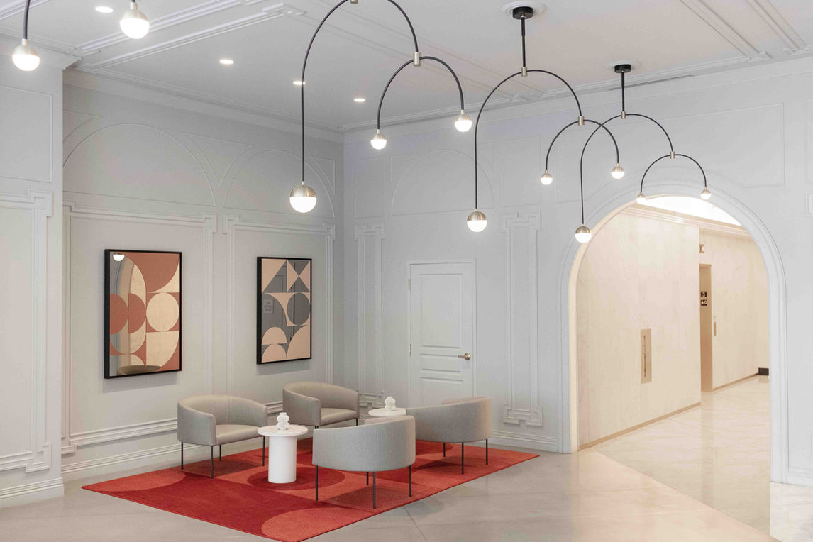 Our work at the ground-floor lobby uses materials that merge traditional and modern elements. Wrapping a concierge desk, we called for Italian marble that uses richly textured patterns hand-chiselled to mimic the effect of leather. Art Deco Fluted marble lines the elevator lobby and walls, while fine molding defines the double-barrel vault ceiling. Custom pieces include the leasing, co-working, and reception desks as well as marble tables at seating areas.